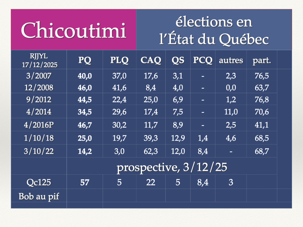 À la suite de la démission d’Andrée Laforest députée de la circonscription de Chicoutimi à partir du 1 octobre 2018, il y aura là là là élection au plus tard début mars prochain. Le Devoir, 4 septembre 2025.