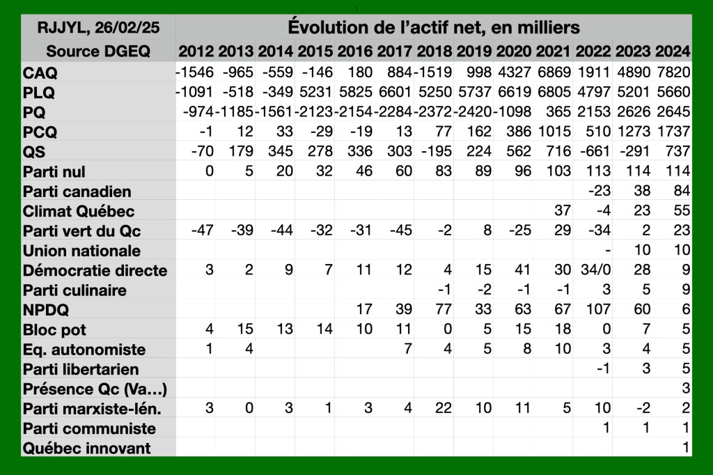 Fort d’un actif net de 33 000 $ atteint en 2014, le PCQ s’est endetté en 2015 et 2016 et disposant après une année d’élection d’un 77 000 d’actifs nets en 2018, il se tire de l’élection de 2018 avec un actif de 2,153 millions de $ qui en deviennent en 2024, 2,645.