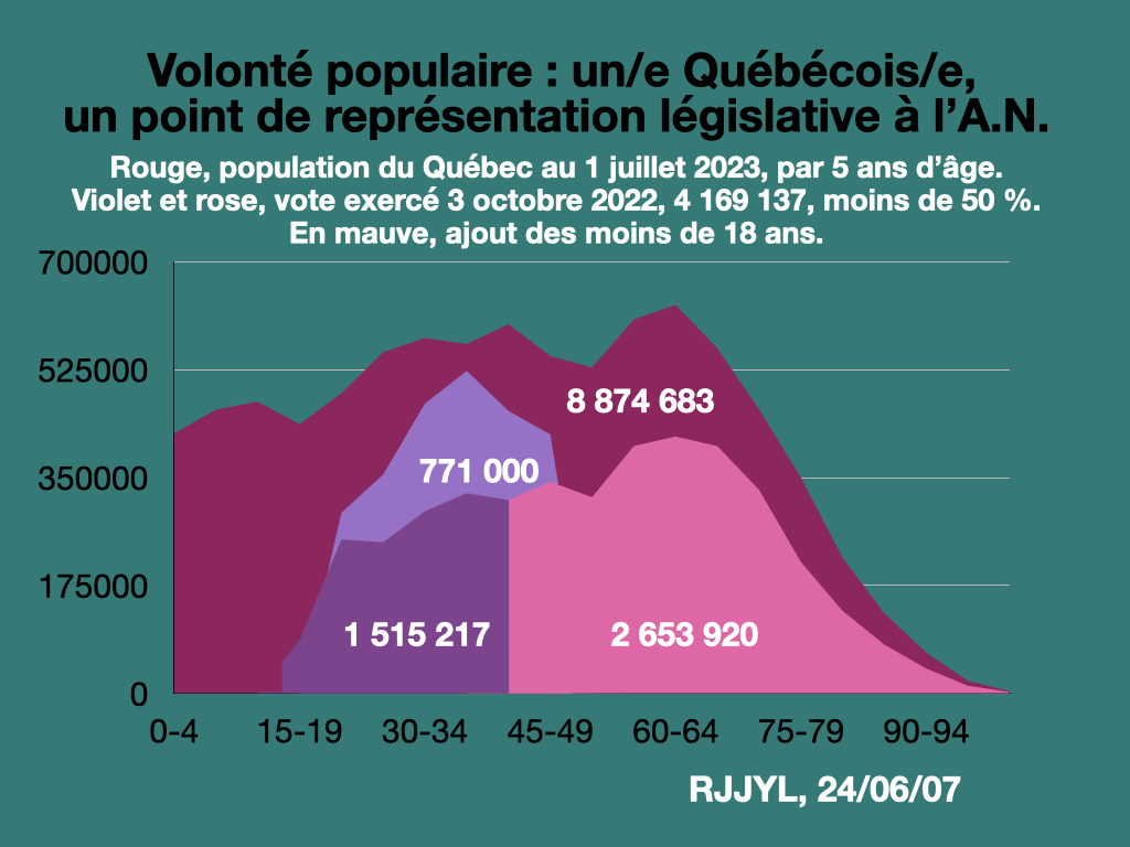 Je suis un Québécois sur environ 6,5 millions, inscrits& à notre liste électorale. Un peu plus de 4 millions de nous se prévalent de leur droit de vote lors d’une élection générale. C’est ainsi que 125 de nous accèdent pour quatre années prévues à notre Assemblée nationale, à la gouvernance de notre peuple de quelque 9 millions de personnes, reconnu le 9 décembre 2022, me semble, par force de loi,