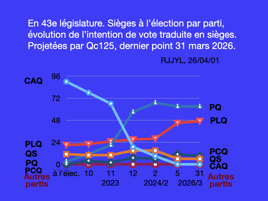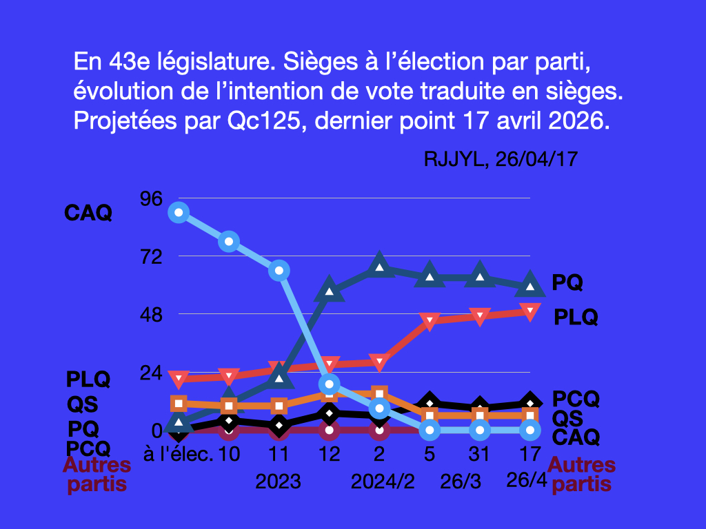 En dernières projections le 5 mars dernier, le PQ baisse légèrement à 63, le PLQ bondit de 28 à 45 et le PCQ de 6 à 11, QS chute de 15 à 6 et la CAQ de 9 à 0 où il rejoint avec 15 % du vote plutôt que moins que 1 % les partis sans élus&.