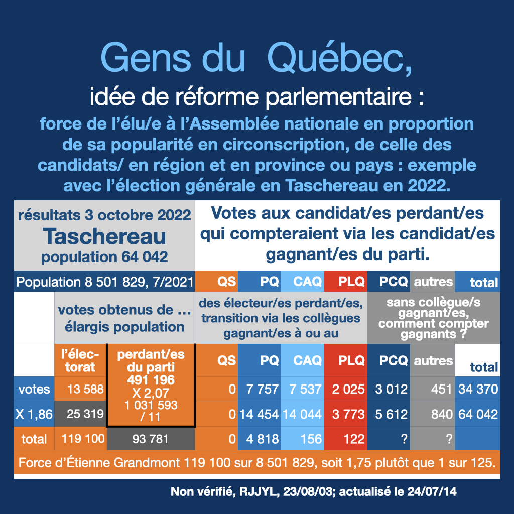 considérant le fait que le poids d’une voix à l’Assemblée nationale est de 1 sur 125 maximum et que par ailleurs le pourcentage de sièges mérités n’est pas fondé sur le pourcentage du vote obtenu à l’élection d’octobre 2022, la force de représentation de la majorité des votes n’est pas égale à un, allant à l’encontre du principe de l’égalité des électeurs/;